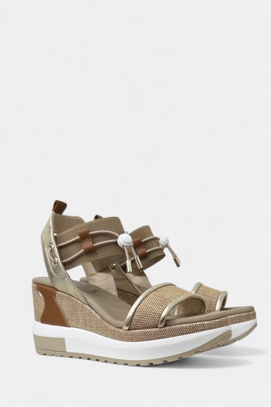 NeroGiardini E616050D tan/ raffia/gold leather wedges