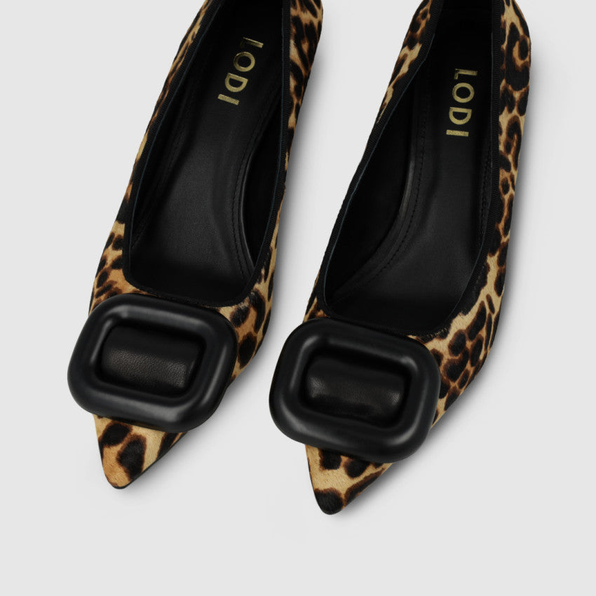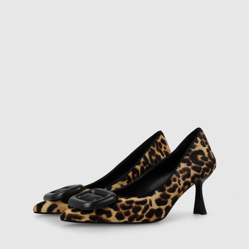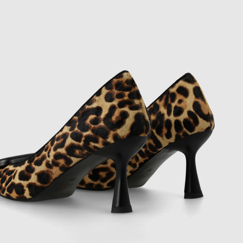 TUC-P women´s pumps by LODI in haircalf animal print leather. Detail of leather decoration. A design crafted with a 7.5 cm painted heel. Pointed toe. Leather-lined interior. Includes new gel insole for greater comfort in every step.