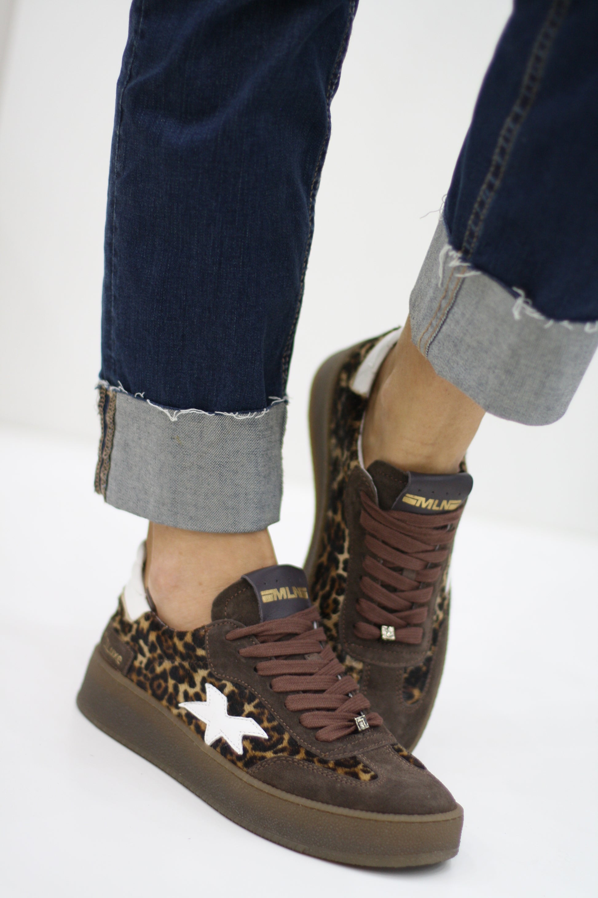 MELINE SHOES 526 BROWN LEOPARD PRINT AND SUEDE LEATHER TRAINERS